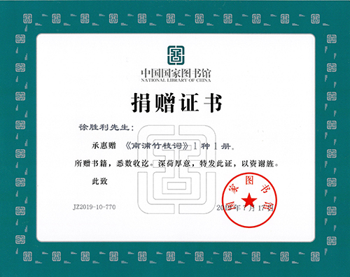 徐胜利先生的著作《南浦竹枝词》一书于2019年7月17日被中国国家图书馆收藏,该书是作者歌咏湖北鄂州市历史文化、山川风物、民俗风情的竹枝词集。包括《洋澜湖棹歌》《武昌纪事诗》《鄂州风物吟》三组竹枝词各一百首。