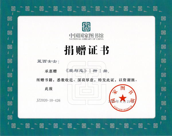旅法音乐人蓝西女士第一部文学作品《爱与恋》一书于2020年5月21日被中国国家图书馆收藏。本书由百花洲文艺出版社出版发行,并在当当、京东发行销售。
